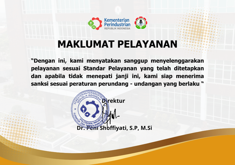 Politeknik Industri Furnitur dan Pengolahan Kayu terus berkomitmen dalam meningkatkan mutu pelayanan di lingkungan kerja Politeknik Industri Furnitur dan Pengolahan Kayu. Kami menyatakan sanggup menyelenggarakan pelayanan sesuai Standar Pelayanan yang telah ditetapkan dan apabila tidak menepati janji ini, kami siap menerima sanksi sesuai peraturan perundang-undangan yang berlaku.